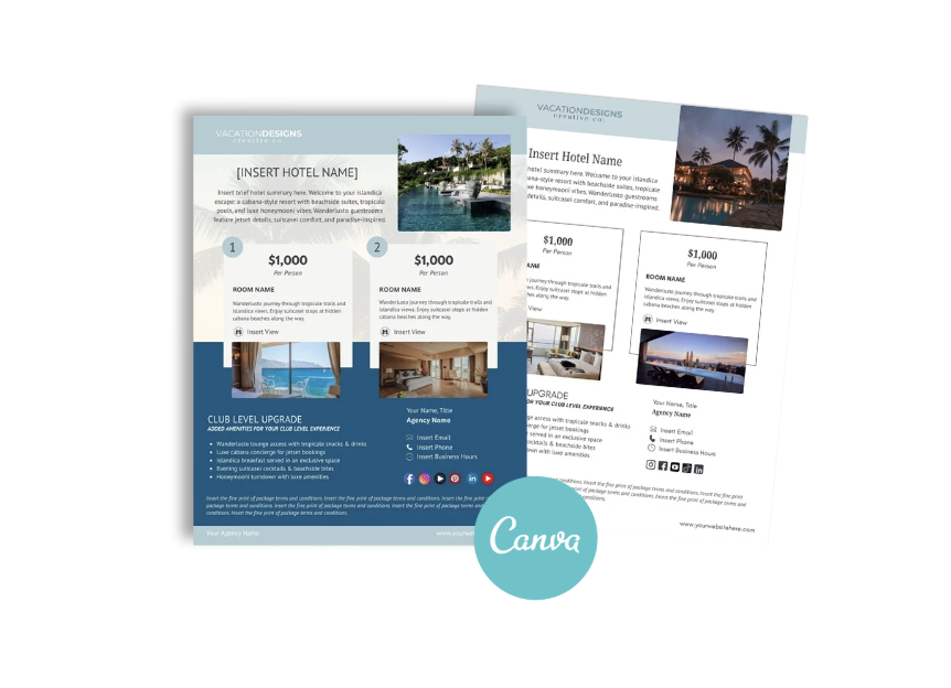 You can respond to inquiries faster, share trip details more clearly, and promote offers with graphics that already feel like your brand. Everything is editable in Canva, so updates take minutes, not hours. Plus, save your hotel profiles as you build for quick use!
